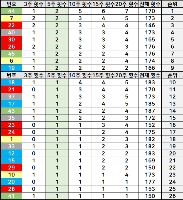 45개 번호를 5주 출현 횟수로 정렬한 자료입니다. 2회 1회 출현한 번호들이 보이는데요.