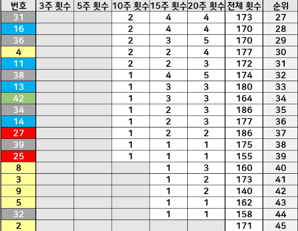 45개 번호를 5주 출현 횟수로 정렬한 자료입니다. 2회 1회 출현한 번호들이 보이는데요.