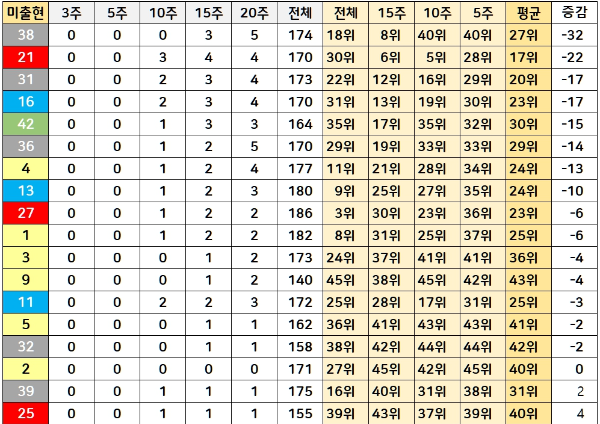 5주간 미출현 번호에서는 다음과 같은 자료를 정리했습니다.