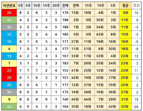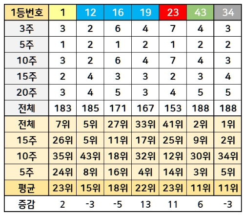 왜냐면 지난번에도 평균순위가 높은 로또번호들이 다수 당첨번호에 포함되었습니다.
