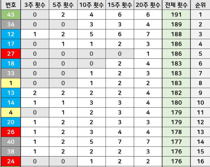 역대 당첨 횟수를 기준으로 조사한 자료입니다. 상위권에 있는 번호들은 로또 예상번호 후보로 사용하기 좋은 자격을 갖추고 있습니다.