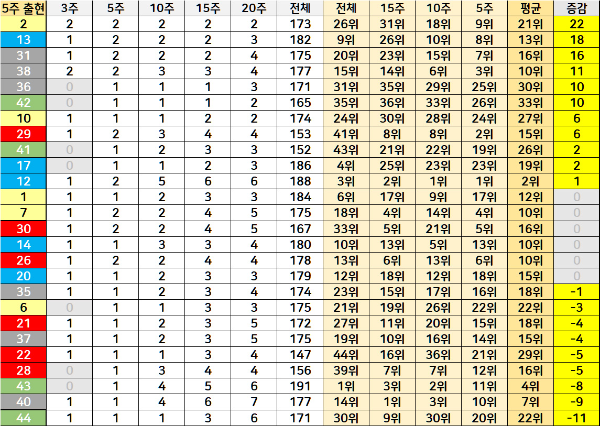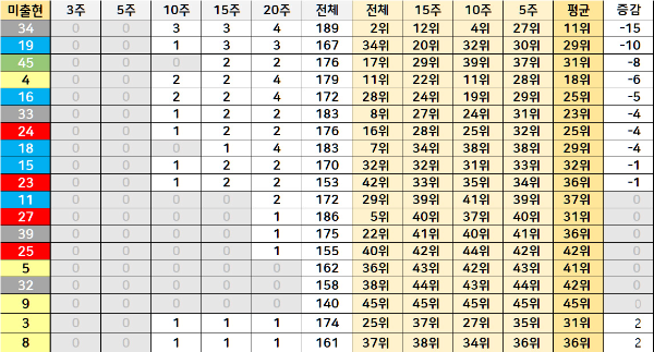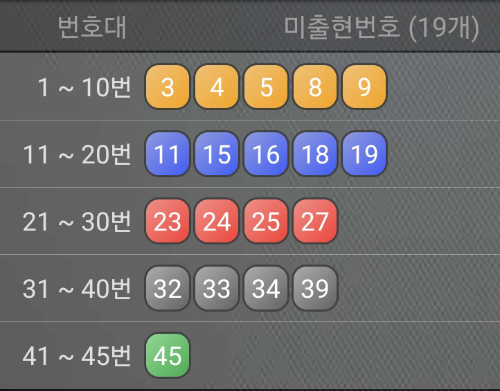 최근 5주간 미출현번호에서는 우선 15주이상 장기간 미출현번호는 제외시키고 선택할게요.