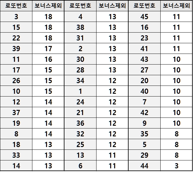 매주 나오는 로또번호들이 다르기 때문에 보너스를 제외하고 분석하는 분들도 있습니다.