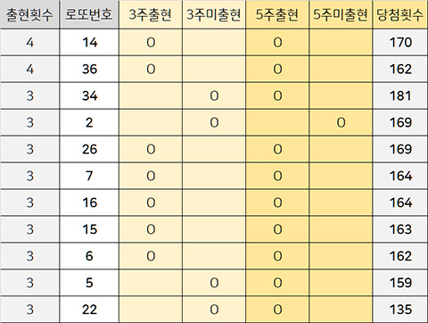 14번 36번이 4회 출현한 것으로 확인되면, 두 숫자 모두 3주 출현번호이면서 5주 출현번호에 해당됩니다.