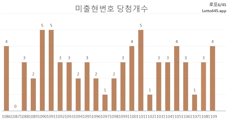 회차별 미출현 번호 당첨개수 통계 차트를 보면 지난주 1109회차에 5주 미출현번호에서 4개 번호가 일치했습니다.