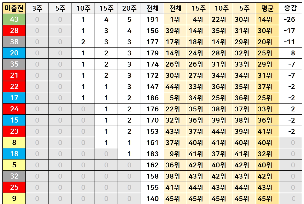 미출현 번호 분석: 최근 5주간 미출현 번호 중에서 38, 43, 28, 20, 35가 주목할 만한 번호입니다. 이 중에서 특히 38, 43번은 역대 당첨 횟수도 높아, 당첨 가능성이 더욱 기대됩니다.