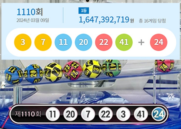 1110회 로또 당첨번호 추첨결과 1등 16명 2등 118명으로 당첨자 배출되었으며, 로또 1등 번호는 3 7 11 20 22 41으로 발표되었으면 보너스는 24로 확인됩니다.