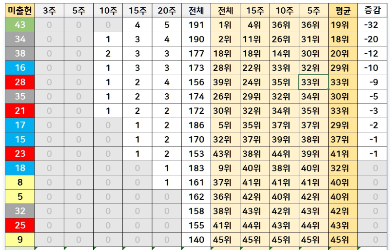 평균 순위는 기간별 출현순위를 평균한 것이고, 증감은 15주 순위 대비 5주 순위의 증감순위를 계산한 것입니다. 증감값으로 정렬하여 표시했습니다.