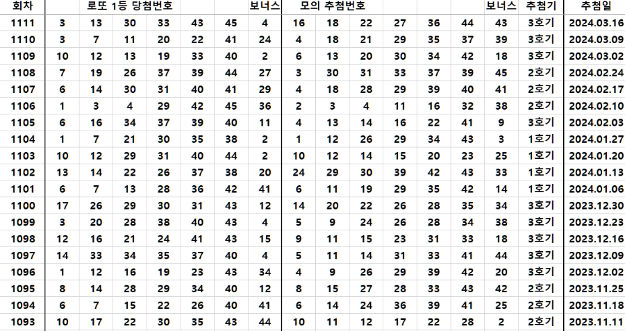 분석 결과를 종합해보면 1111회 당첨번호는 직전 5주 출현번호(3, 13, 30, 33, 45, 4)와 일치하는 추세였고, 5주 미출현번호에서 1개(43)만 나왔습니다. 따라서 이번 1112회에는 5주 출현번호에서 더 많은 번호가 나올 것으로 예상됩니다.