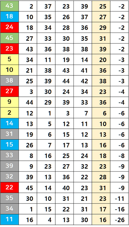 다음 자료는 최근 들어 당첨 횟수가 감소되어 당첨 순위가 나빠지는 번호들입니다.