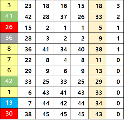 아래 표에서는 36번, 8번이 로또 1048회 당첨 가능한 예상 번호로 분석 됩니다.