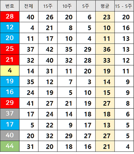 로또 번호 45개를 역대 전체 당첨기간, 15주 기간, 10주, 5주 기간의 출현횟수로 순위를 계산하였고, 이들 순위를 평균한 순위도 계산하였습니다.