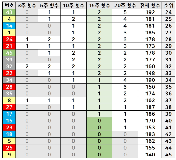 15주간 미출현 번호는 모두 6개가 확인되었는데, 15 23 18 5 25 9번으로 참고하세요.