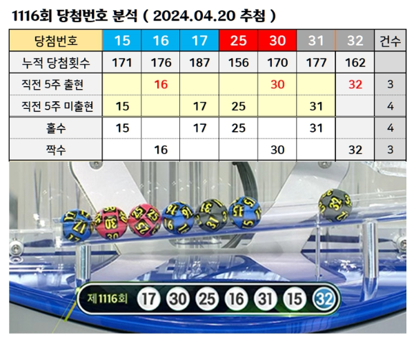 1116회차 로또번호 추첨에서 1등 당첨 번호는 15, 16, 17, 25, 30, 31이며, 보너스 번호는 32였습니다. 이번 당첨번호들은 홀수와 짝수가 거의 균등하게 분포되어 있으며, 연속쌍 번호의 출현이 두드러졌습니다(15 16, 16 17, 30 31, 31 32).