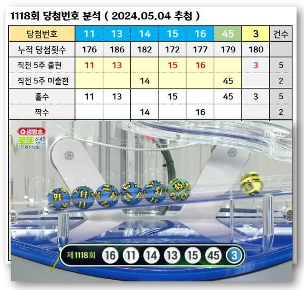 로또 1118회 당첨번호는 11, 13, 14, 15, 16, 45와 보너스 번호 3으로, 이번 회차에서는 연속 숫자가 아주 많이 나왔습니다. 연속된 숫자 13-14, 14-15, 15-16이 당첨번호로 나타나 상당히 이례적인 경우로 평가되었습니다.
