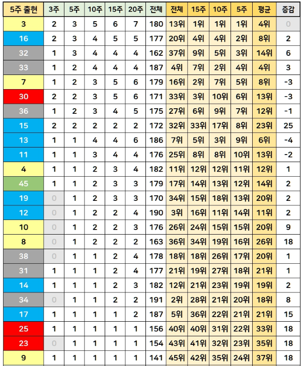 분석표는 왼쪽은 3주 5주 10주 15주 20주 전체 기간으로 출현횟수를 집계하였고, 오른쪽은 출현순위를 계산하여 평균과 15주 대비 증감 순위를 계산하였습니다.