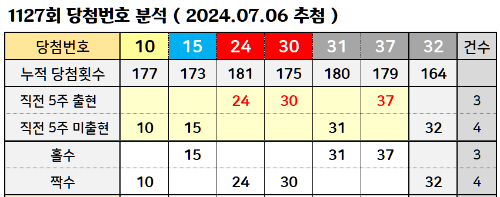 뜨거운 수는 최근 10주와 5주 이내에 많이 출현한 번호를 말하며, 차가운 수는 이 기간 동안 적게 출현한 번호를 의미합니다. 1127회에서는 뜨거운 수 중 30번과 31번이 포함되었으며, 차가운 수 중에서는 10번과 15번이 당첨번호로 나왔습니다.