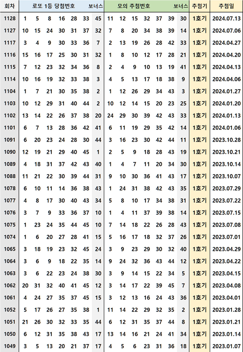 1128회 로또 당첨번호와 복권 리허설의 모의번호까지 정리하였고, 1호기에서 추첨된 번호들만 모았습니다.
