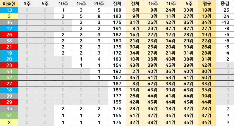 20번 역시 최근 5주간 모습을 감췄습니다. 20이라는 숫자는 많은 문화권에서 중요한 의미를 가집니다. 성년의 나이, 새로운 시작 등을 상징하죠. 이런 상징성 때문에 많은 사람들이 선택하는 번호일 가능성이 높습니다.