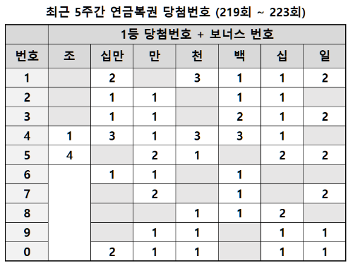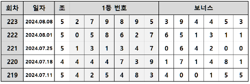 이번 223회 당첨 결과를 보면, 5조가 1등 번호로 선정되었는데요. 이는 최근 5주간의 추세와도 일치하는 부분이에요.