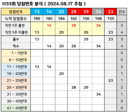 특히, 1133회에서 13번과 29번은 미출현 번호였는데, 이 번호들이 오랜 기간 출현하지 않다가 당첨번호로 선택된 것은 중요한 포인트입니다. 13번은 5주 이상 출현하지 않았고, 29번도 비슷한 기간 동안 나타나지 않았습니다. 이는 미출현 번호에 대한 분석이 로또 번호 선택에 얼마나 중요한지를 다시 한번 확인시켜줍니다.