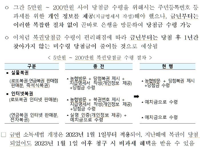 요점은 2023년 1월 1일 부터 200만원이하 당첨금을 수령할 때, 세금을 떼지 않게 됩니다.