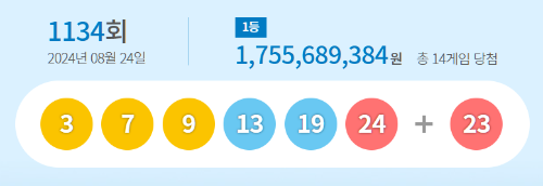1134회 로또 추첨 결과, 당첨번호는 3, 7, 9, 13, 19, 24였고, 보너스 번호는 23이었어요.