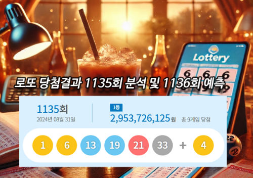 오늘 토요일 저녁은 로또 당첨 번호부터 확인했어요. 혹시나 하는 마음에 가슴이 두근거리더라고요. 이번 주 1135회 로또 당첨번호가 발표되었는데, 1, 6, 13, 19, 21, 33, 그리고 보너스 번호 4였어요. 혹시 맞으신 번호 있으셨나요? 오늘은 이 추첨 결과를 꼼꼼히 분석해보고 다가오는 9월 1136회 로또 예상번호도 함께 살펴보려고 해요.