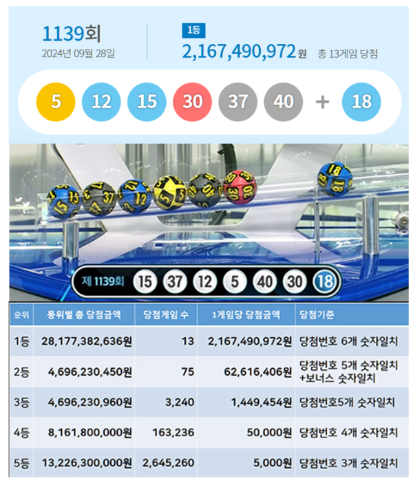 1139회 로또 당첨번호 결과 분석 및 이번주 로또 1140회 당첨 예상번호 찾는 로또분석 숨은 예측번호를 공개해볼게요. 이번 1139회 로또 추첨 결과, 1등 당첨번호는 5, 12, 15, 30, 37, 40이었고 보너스 번호는 18이었어요. 특히 주목할 만한 점은 12번이 역대 누적 당첨횟수 3위(193회)를 기록했다는 거예요.