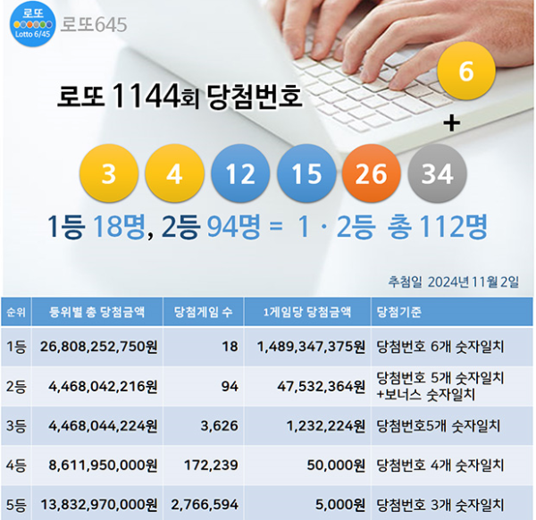1144회 당첨번호는 3, 4, 12, 15, 26, 34 (보너스 6)이 나왔는데요. 무려 18명의 1등 당첨자가 나와서 1인당 당첨금액이 14억 8천만원으로 결정되었습니다.