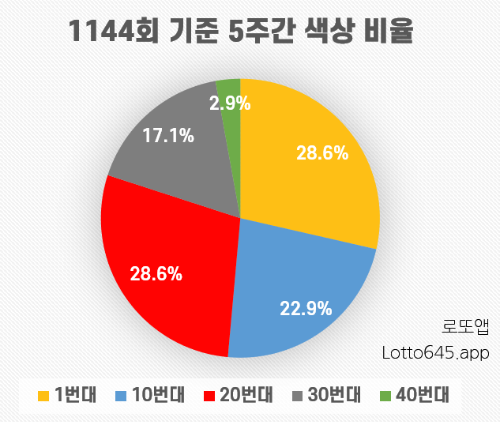 1144회 당첨번호의 색상대별 출현 비율도 특이한데요. 노랑색 1번대(1~10번)는 22.9%, 파랑색 11번대(11~20번)는 28.6%, 빨강색 21번대(21~30번)도 28.6%, 회색 31번대(31~40번)는 17.1%, 녹색 41번대(41~45번)는 2.9%의 분포를 보였습니다. 이는 일반적인 평균 분포와는 다소 차이가 있는 패턴이네요.