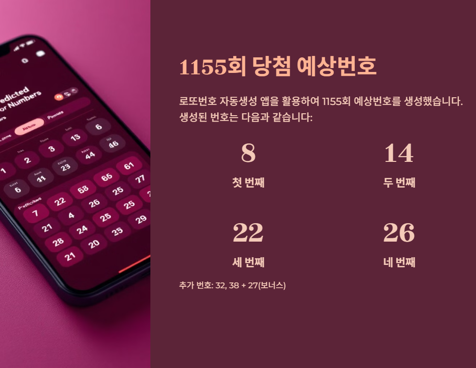 로또번호 자동생성 앱을 활용하여 1155회 예상번호를 생성했습니다. 생성된 번호는 다음과 같습니다. 8, 14, 22, 26, 32, 38 + 27.