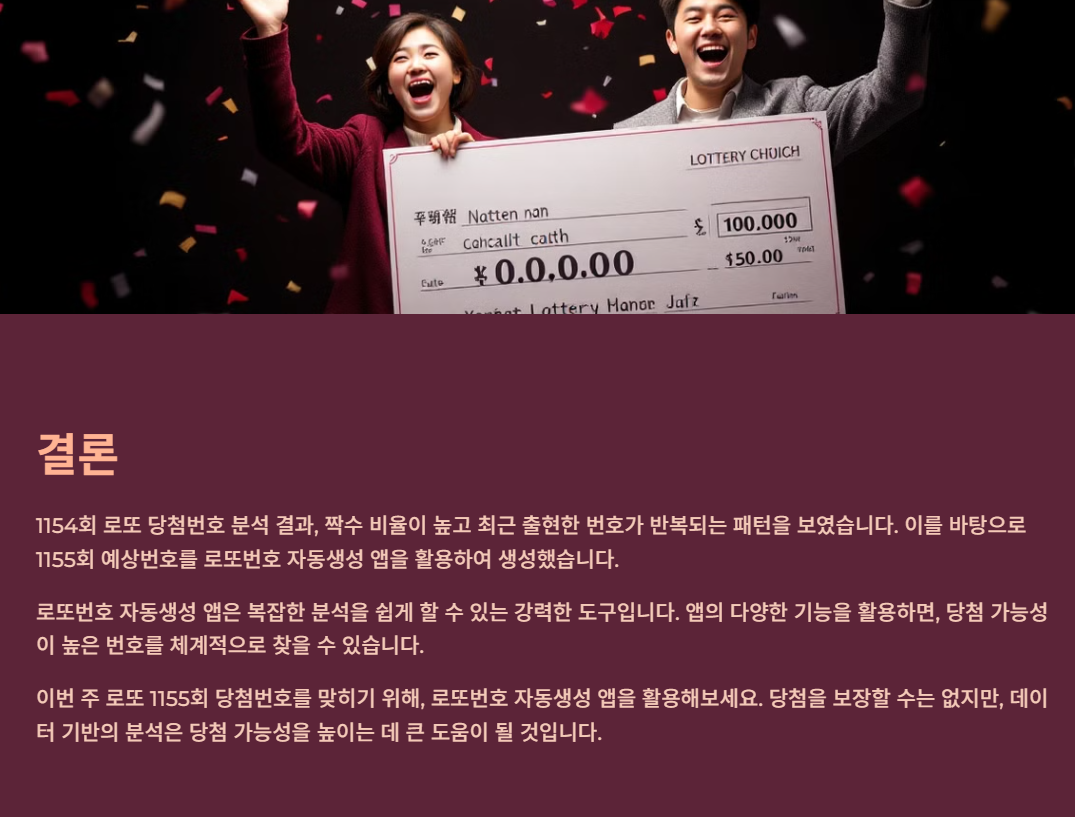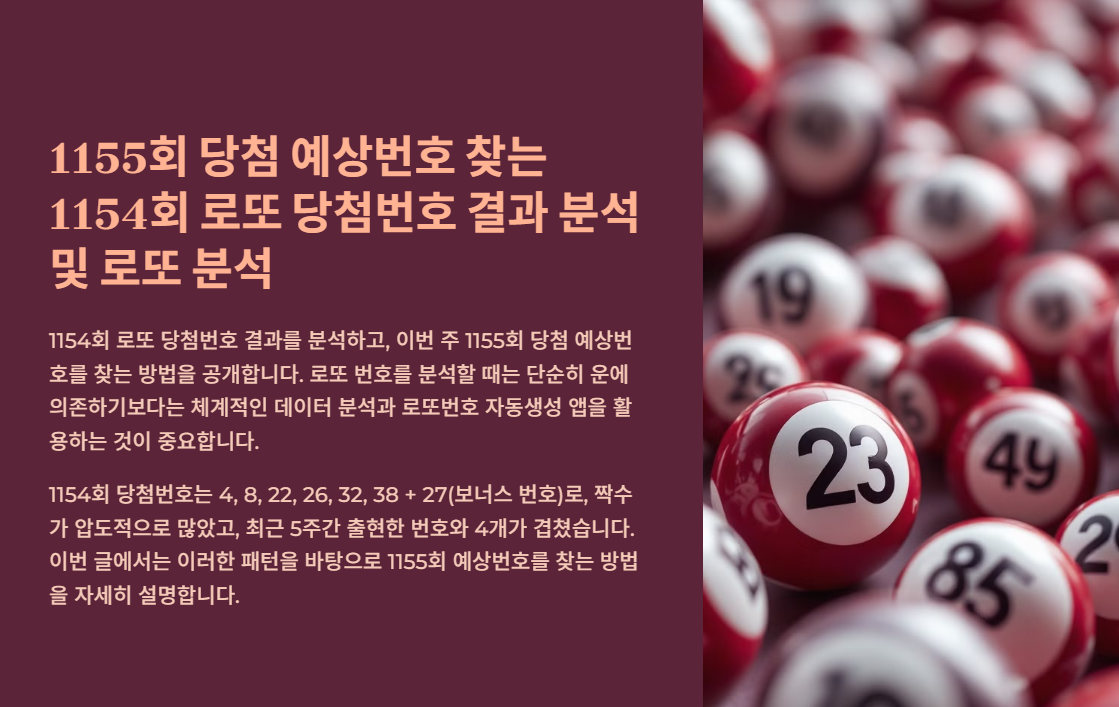 1154회 로또 당첨번호 결과를 분석하고, 이번 주 1155회 당첨 예상번호를 찾는 방법을 공개합니다. 로또 번호를 분석할 때는 단순히 운에 의존하기보다는 체계적인 데이터 분석과 로또번호 자동생성 앱을 활용하는 것이 중요합니다.