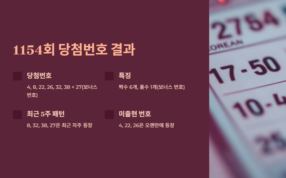 1154회 당첨번호는 4, 8, 22, 26, 32, 38 + 27(보너스 번호)로, 짝수가 압도적으로 많았고, 최근 5주간 출현한 번호와 4개가 겹쳤습니다. 이번 글에서는 이러한 패턴을 바탕으로 1155회 예상번호를 찾는 방법을 자세히 설명합니다.