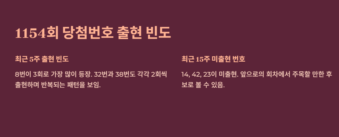 반면, 최근 15주간 미출현 번호는 14, 42, 23입니다. 이 번호들은 앞으로의 회차에서 주목할 만한 후보로 볼 수 있습니다.