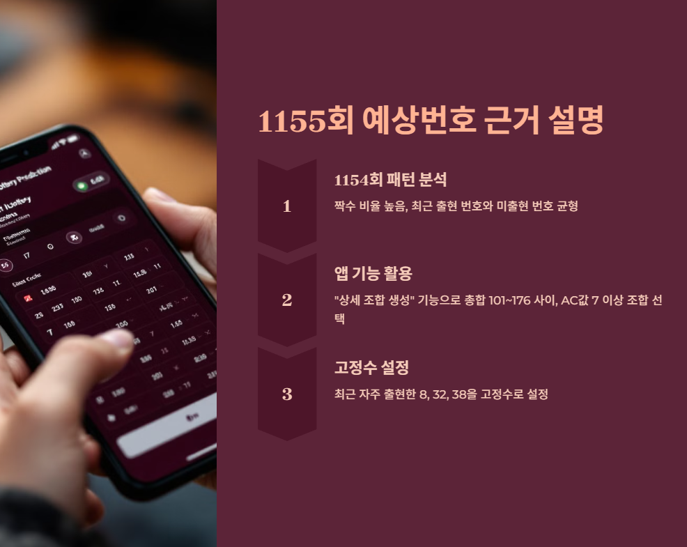 1155회 예상번호는 1154회 당첨번호의 패턴을 바탕으로 선정되었습니다. 짝수 비율이 높고, 최근 5주간 출현한 번호와 미출현 번호를 균형 있게 포함했습니다.