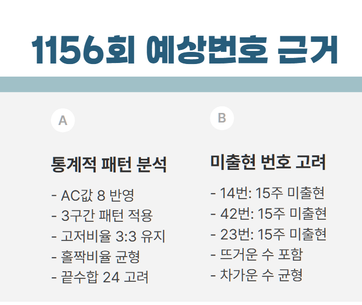1156회 로또는 1호기 추첨기가 사용되며, 앱의 통계 분석을 기반으로 도출한 예상번호 조합들은 모두 AC값 7이상, 적절한 홀짝비율과 고저비율을 갖추어 당첨 가능성을 높였습니다.