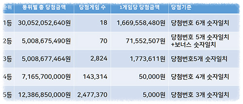 로또 등수별 당첨금액, 인원수 현황입니다.