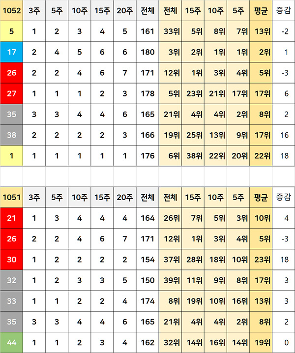 1번은 전체 기간으로 6위, 15주 기간은 38위, 10주 기간으로 22위를 기록한 번호이고, 각 기간별 출현순위를 평균내어서 평균에 평균순위를 표시했습니다.