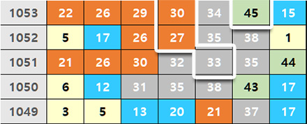 로또 1054회 당첨번호 조합을 분석했을 때 직전 5주간 출현번호에서 4개 번호가 일치하였습니다.