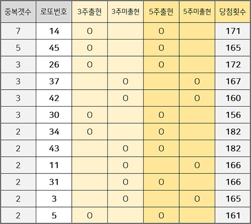 위 표는 2회 출현이상 번호들만 모았구요, 3주 5주간 출현 미출현 여부로 체크하였습니다.