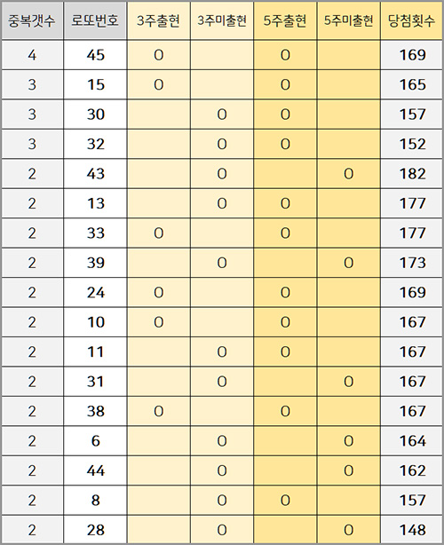 위 표는 2회 출현이상 번호들만 정리한 자료이고, 3주 5주간 출현 미출현 여부로 체크하였습니다.