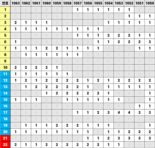 3번은 1063회 기준으로 직전 6주 기간 동안 2회 당첨되었다는 의미이고, 1번은 최근에 당첨되지 않았고, 1057회차 기준으로 직전 6주 기간 동안 한번 당첨되었다는 것입니다.