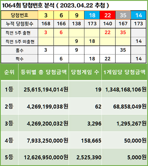 1064회 로또 당첨번호 4월 22일 추첨 결과 직전 5주 출현번호에서 3, 6, 22, 35번이 일치되어 계속 5주간 당첨번호 강세를 보이고 있습니다.