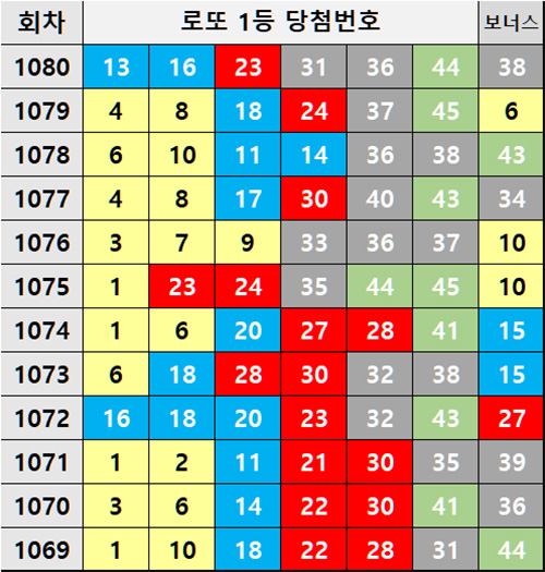 1080회 로또 당첨번호 포함하여 1등 번호와 보너스 번호 내역입니다. 어떤 번호대가 많이 나오고 있는가요?