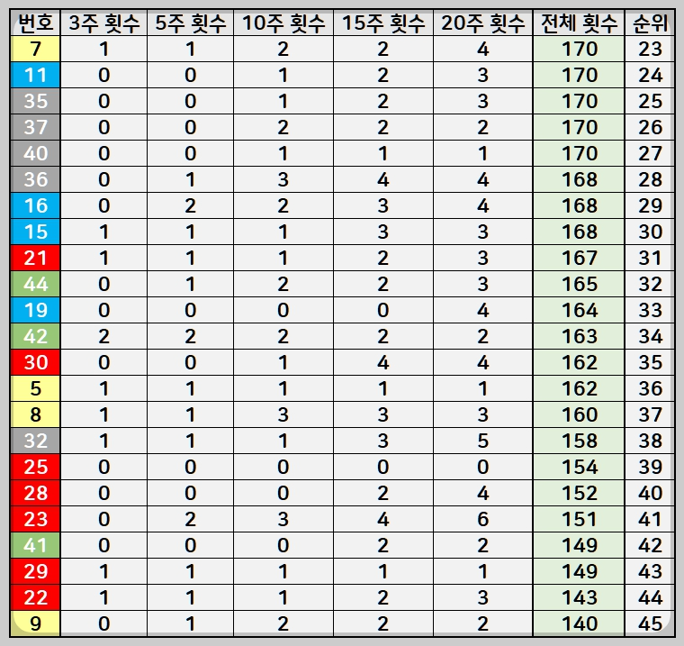 중하위 당첨횟수 번호들은 서열 20위 이후 번호들이라 생각됩니다.