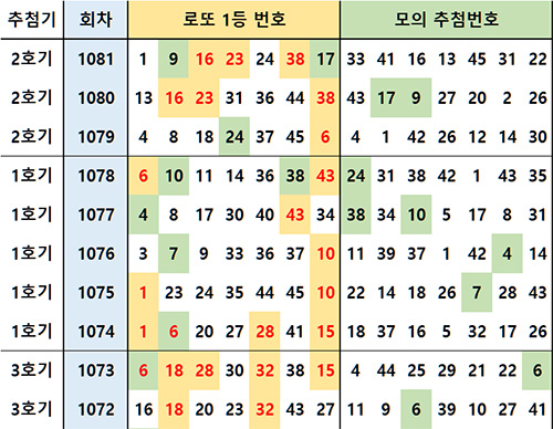1번 6번 38번 43번이 여섯번 나온 것으로 파악됩니다. 1082회 로또 당첨번호 선택에 최우선 생각해보세요.